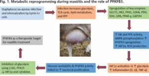 A central regulator of this step is PFKFB3, which produces fructose-2,6-bisphosphate, a potent allosteric activator of PFK. In mastitis, PFKFB3 expression in mammary cells is elevated, and its inhibition has been shown to reduce reactive oxygen species generation, suppress HIF-1α signalling, and alleviate Staphylococcus aureus-induced inflammation, underscoring its importance as both a metabolic driver and a potential therapeutic target (Gao et al., 2024), as shown in Fig.1. Targeting glycolytic regulators has therefore emerged as a promising strategy to control this metabolic overactivation.