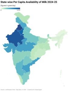 The darkest shades on the map are concentrated in north-western and central India, forming the country’s dairy heartland. States such as Punjab, Haryana, Rajasthan, Gujarat, Madhya Pradesh, Andhra Pradesh, and Himachal Pradesh report per capita availability ranging from 650 g/day to well over 1,300 g/day.