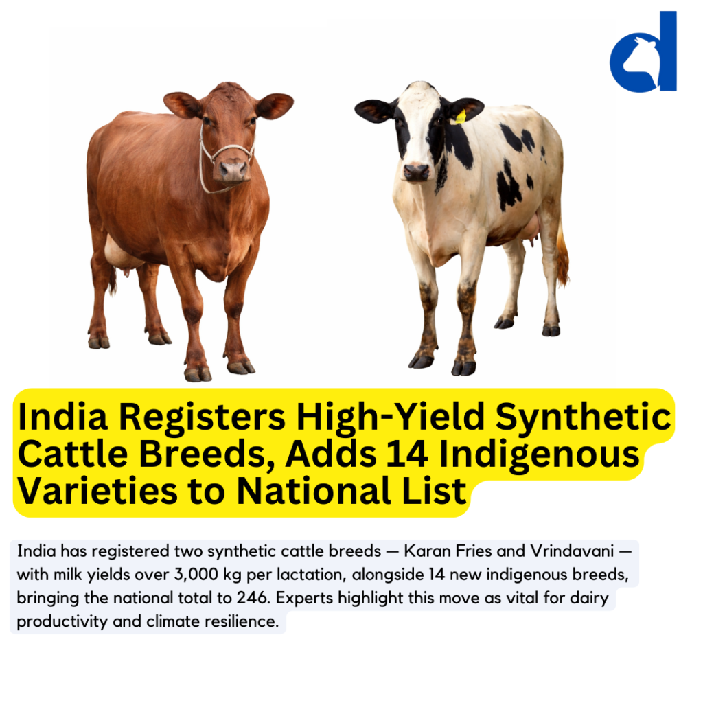 New Delhi | January 14, 2026 – In a significant step for the Indian dairy industry, the Government of India has officially registered two high-yielding synthetic cattle breeds, Karan Fries and Vrindavani, each capable of producing over 3,000 kg of milk during a 10-month lactation cycle, well above the average yield of indigenous breeds (1,000–2,000 kg).