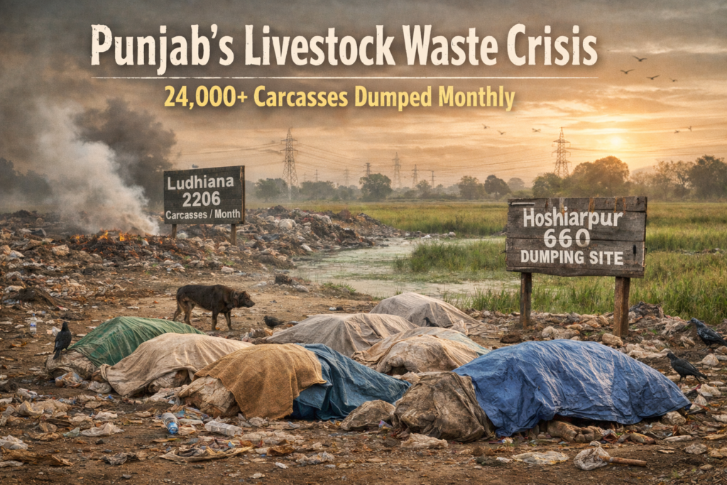 Bathinda, Punjab: A recent audit submitted to the National Green Tribunal (NGT) has unveiled a severe and growing crisis in livestock waste management across Punjab, one of India’s largest dairy and livestock-producing states. The report exposes that more than 24,000 cattle carcasses are being disposed of every month across a staggering 5,541 informal dump sites, mostly unregulated and environmentally hazardous.