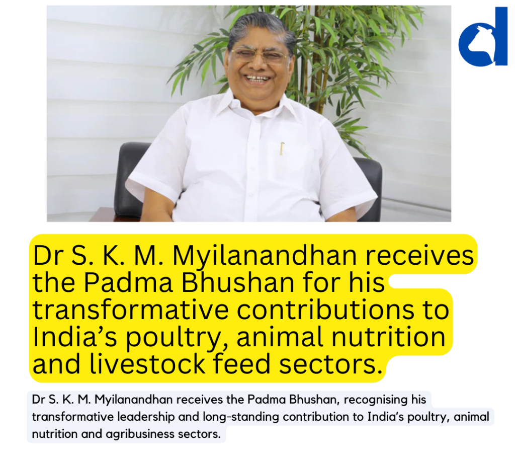 The conferment of the Padma Bhushan on Dr S. K. M. Myilanandhan (popularly known as SKM) marks a significant moment not only for the poultry industry, but for India’s broader livestock and animal nutrition ecosystem. The award recognises decades of institution-building, entrepreneurial foresight and sectoral leadership that have helped shape modern feed systems in the country.