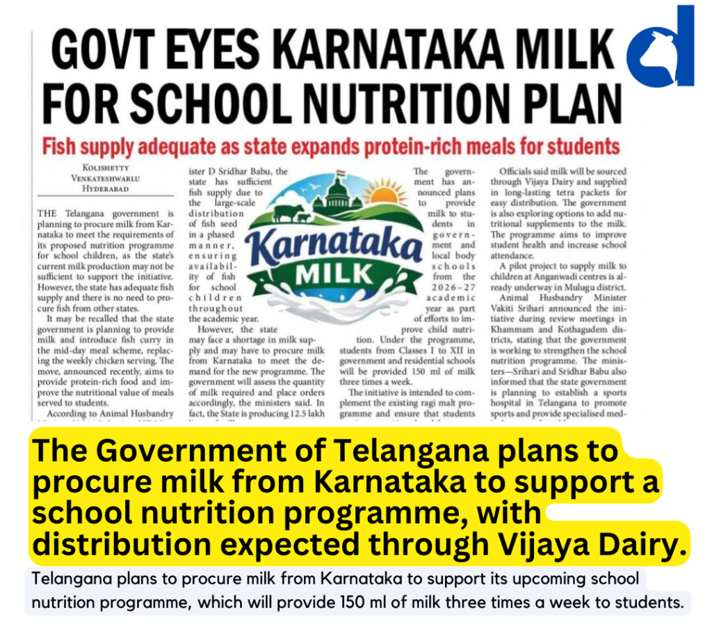 The Government of Telangana is exploring plans to procure milk from Karnataka to support its proposed school nutrition programme, as current local production may not be sufficient to meet the initiative’s requirements.