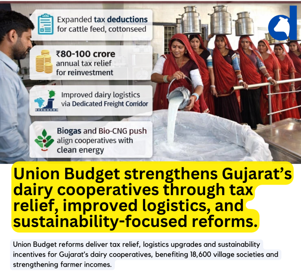 The Union Budget delivers a strong fiscal and infrastructure push to Gujarat’s dairy cooperative sector. It removes key tax hurdles, improves logistics, and promotes sustainability. As a result, farmers are likely to see better income realisation, while cooperatives can operate more efficiently.